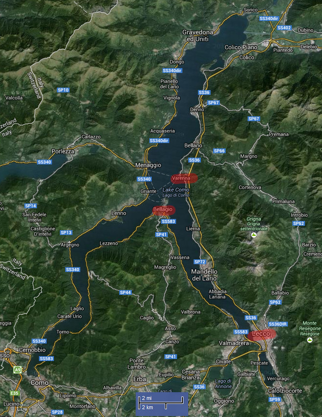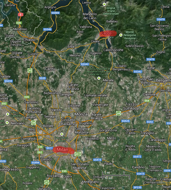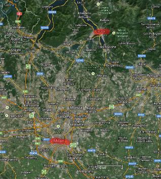 | We landed in Milan and hired a car to take us to Lecco (left map). Lecco is at the end of the southeast leg of Lake Como (right map). The next morning we took our coach up the shore to Varenna and a ferry across to Bellagio. In the afternoon, we visited downtown Milan. |